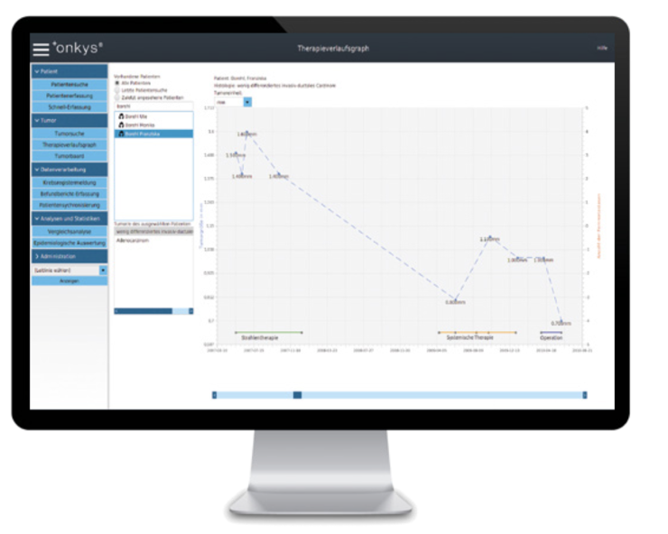 Brust-, Darm- und Prostatakrebs sind die häufigsten Krebserkrankungen in Deutschland. Deshalb können diese Krebserkrankungen in onkys® besonders ausführlich dokumentiert werden. onkys® erkennt automatisch, wenn eine Krebserkrankungen dokumentiert wird und welche Zusatzfelder sinnvoll sind. Als Bestandteil des ADT/GEKID-Basisdatensatzes werden die Angaben an das Krebsregister des jeweiligen Bundeslandes weitergereicht und können so an einer zentralen Stelle gesammelt und ausgewertet werden. Das führt langfristig zu einer Verbesserung der Behandlung von Tumorerkrankungen.